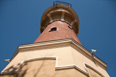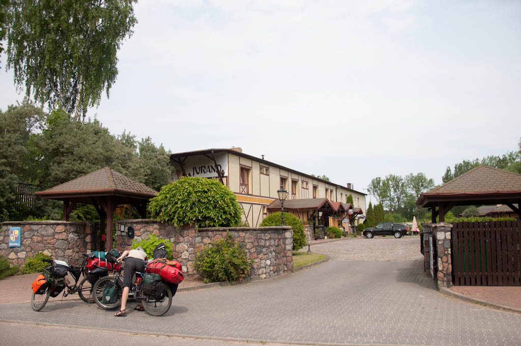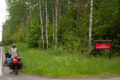 Nach einer unruhigen Nacht mit vielen Mücken entschließen wir uns am nächsten Morgen zu einer 200m weiter vorn an der Straße gelegenen Pension mit Rasen umzuziehen, wo wir am Vortag bereits Campingmöglichkeit gesehen hatten. Wir werden von der Deutsch-Englisch-Französisch sprechenden Familie herzlich willkommen geheißen und sind die ersten Gäste. Wir erhalten einen Schlüssel für ein Zimmer, um Bad und WC nutzen zu können. Nach Zeltaufbau, Wäschewaschen und Fahrradpflege geht es gegen Mittag in die Stadt. Ein kurzer Abstecher zum Bahnhof bestätigt uns, dass in Gołdap schon lange keine Züge mehr fahren. So müssen wir unser Rückreiseplanung auf später verschieben. Im Stadtzentrum finden wir mit der Restauracja Matrioszka (Partyzantów 27) ein schönes Etablissment, wo man gut zu angemessenen Preisen essen kann. Für Arnos Mittagsschlaf setzen wir uns wieder auf die Räder. Da mein Interesse an Militäranlagen noch nicht ganz gestillt ist und ich auf großes Hangars des Hauptquartiers der Luftwaffe im Norden von Gołdap hoffe, kann ich Christiane überreden einen Abstecher dahin zu machen. Wir fahren von der 65 aus in den Wald hinein und finden nichts bis auf eine alte angebliche Abschussrampe. Nach Durchquerung des Waldes treffen wir auf ein Sanatorium wo auch die Militäranlage (nur ein paar Bunker) beschildert ist. Wir fahren aber über den alten Bahndamm zurück in Stadt und besteigen den alten Wasserturm. Im Café genießen wir bei toller 360°-Aussicht Eisbecher und Kaffee. Danach fahren wir nochmal in die Stadt in der Hoffnung auf einen Spielplatz, finden jedoch nichts und verbringen noch etwas Zeit auf dem schön gestalteten plac Zwycięstwa im Zentrum. Beim Abendessen auf dem Campingplatz steht ein älteres französisches Pärchen in der Einfahrt auf der Suche nach einer Unterkunft. Wir winken sie herein und überreden sie zu bleiben. Wie sich herausstellt machen sie von April bis September eine Rundtour von der Bretagne aus um Nord- und Ostsee herum.