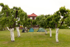 Vor unserem Aufbruch besuchen wir noch das Schloss/Gut der Lehndorfs in Sztynort. Die verwunschene Anlage ist in jedem Fall einen Abstecher Wert auch wenn das Gebäude nicht begehbar ist. Besonders hat es mir der ruhige Park mit der uralten Eichenallee angetan. Die Stille dort im Gegensatz zum geschäftigen Treiben im Jachthafen ist einfach wunderbar. Danach passieren wir in entspannter Fahrt auf guter Straße Pozezdrze, wo gerade eine Fronleichnamsprozession in vollem Gange ist. Von Bunkeranlagen haben wir genug, sodass wir auf einen Abstecher zu Himmlers Bunkeranlage nördlich des Ortes verzichten. Beim Picknick an der Schleuse von Przerwanki gesellt sich ein sportliches Radfahrerpärchen aus dem Spreewald zu Thomas und uns. Diese machen die Masurenrundtour wie sie im Cyklos-Radreiseführer beschrieben ist und haben einiges zu berichten. Nach einer Stunde Rast fahren wir auf dem mäßig guten Waldweg die kurze Strecke zum geplanten Campingplatz direkt am Nordufer des J. Gołdopiwo weiter. Dieser erweist sich nicht nur preislich als Glückstreffer (50 Zł für unsere 3 Zelte) sondern ist auch von der Lage her idylisch. Ruhig gelegen, direkt am See, einfache aber gute sanitäre Anlagen (wenn auch für die Hochsaison sicher nicht ausreichend, 1 WC, 1 Dusche). Wir sind wieder die einzigen Gäste mit Zelt am Platz. Nach einem Bad im See und einer Runde mit dem Tretboot (eigentlich hatten wir vor mehr Boot zu fahren, kamen aber nicht dazu) klingt der Tag bei langen Gesprächen mit Thomas aus, bevor sich unsere Wege am nächsten Morgen trennen.